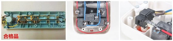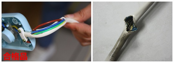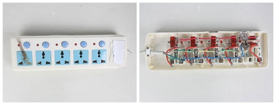 大家通過仔細觀察可以看到劣質(zhì)產(chǎn)品已經(jīng)完全融化了,這就是之前提到的排插線材問題。由于線材質(zhì)量太差,在長時間的家庭使用中,過載的電流把劣質(zhì)的線材融化,而插頭也因為電流的擊打而整個壞掉了。