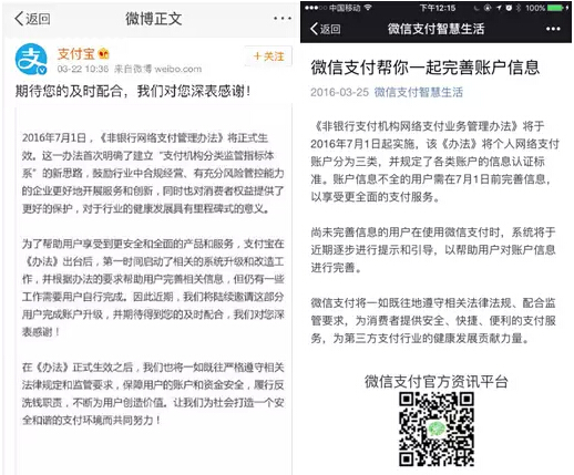 受到央行新規(guī)的約束,支付寶、微信支付等網(wǎng)絡(luò)支付平臺(tái)為了保證用戶在7月1日后依然能順利使用現(xiàn)有支付服務(wù),因此紛紛開始行動(dòng)。